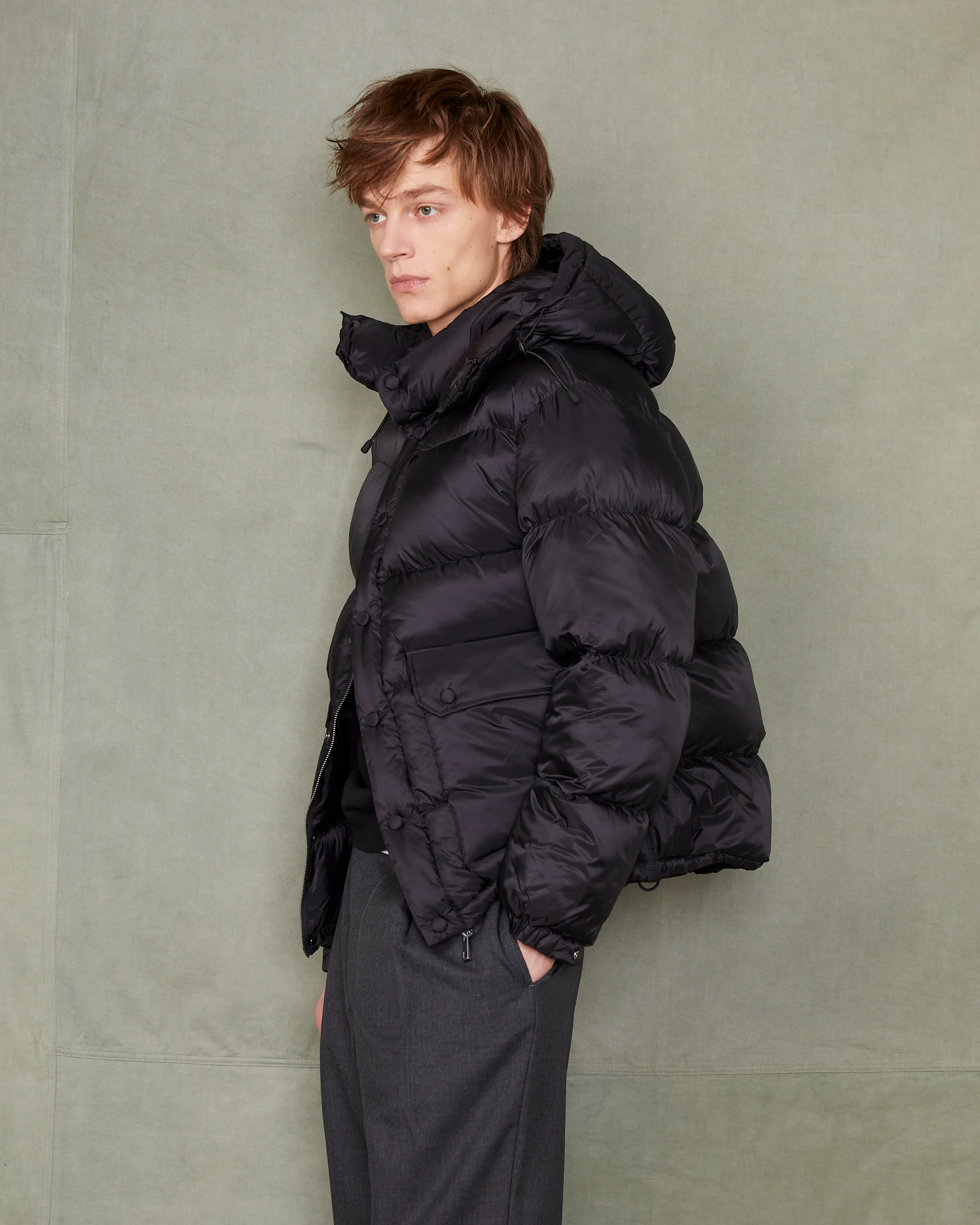 Down jacket with removable hood. Self fabric covered snaps. Piping at armholes. Patch pockets. Lined in self fabric. Primaloft down. Italian water repellent nylon. |• 100% nylon